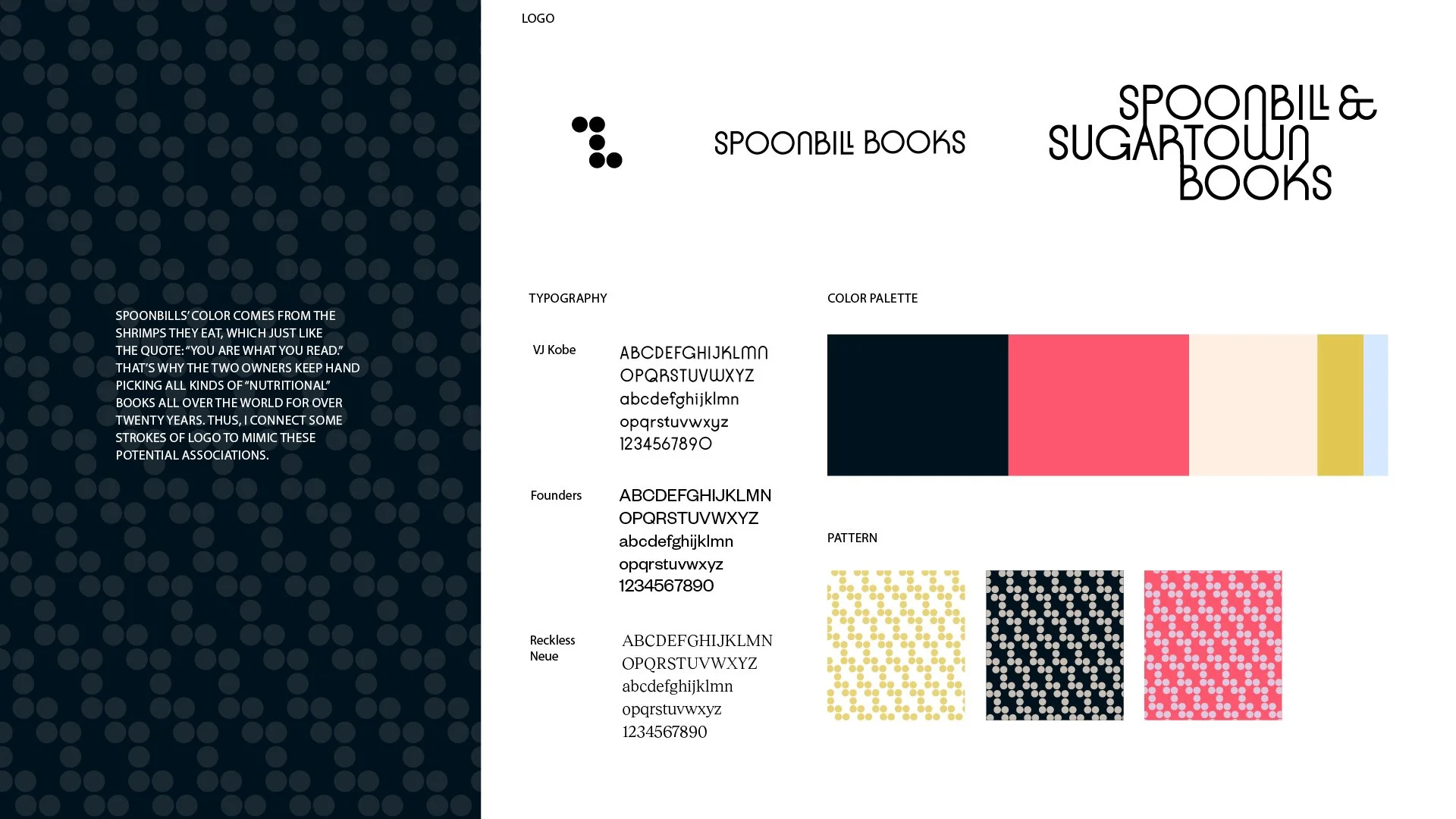 Spoonbills are known for their pink feathers, which come from the shrimp they eat. The nutrients from their diet influence their appearance. This characteristic connects closely to the idea behind the bookstore: you are what you read. To emphasize the relationship between good books and great minds, I refined the logo by allowing the strokes to remain continuously connected, forming a network-like structure that represents knowledge.